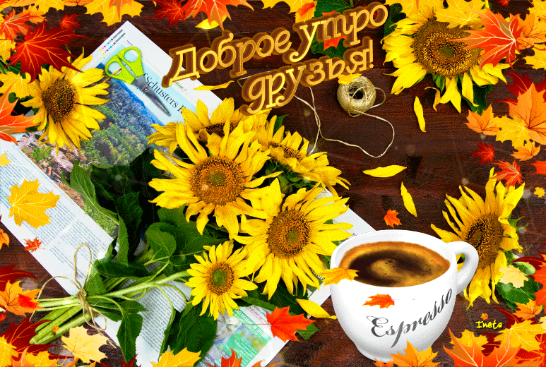 Категория: Доброе Утро | Добавил: inetik | Теги: кофе, кружка, Подсолнухи, открытка, Анимация, утро, осень, gif, Листья